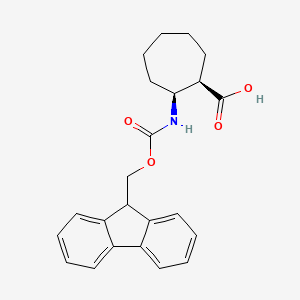 The mechanism of action of (1R,2S)-2-({[(9H-fluoren-9-yl)methoxy]carbonyl}amino)cycloheptane-1-carboxylic acid involves its role as a protecting group in peptide synthesis. The Fmoc group protects the amino group of the amino acid, preventing unwanted side reactions during the coupling process. Once the desired peptide bond is formed, the Fmoc group is removed, allowing the free amino group to participate in further reactions.