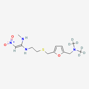 This compound is structurally identical to ranitidine, with the exception of six hydrogen atoms on the N,N-dimethylamino group, which are replaced by deuterium atoms. This specific labeling results in a molecule that is chemically similar to the parent drug but has a distinct, higher molecular weight, allowing for clear differentiation in mass spectrometry. The compound is typically available as a hydrochloride salt to improve its stability and solubility.