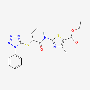 The synthesis of ETHYL 4-METHYL-2-({2-[(1-PHENYL-1H-1,2,3,4-TETRAAZOL-5-YL)SULFANYL]BUTANOYL}AMINO)-1,3-THIAZOLE-5-CARBOXYLATE typically involves multi-step organic reactions. The process begins with the preparation of the thiazole ring, followed by the introduction of the tetrazole moiety and other functional groups. Common reagents used in these reactions include thionyl chloride, ethyl acetate, and various amines. The reaction conditions often require controlled temperatures and the use of catalysts to ensure high yields and purity.