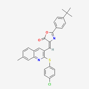 (4E)-2-(4-Tert-butylphenyl)-4-({2-[(4-chlorophenyl)sulfanyl]-7-methylquinolin-3-YL}methylidene)-4,5-dihydro-1,3-oxazol-5-one is a complex organic compound with potential applications in various fields such as chemistry, biology, and medicine. This compound features a unique structure that includes a tert-butylphenyl group, a chlorophenylsulfanyl group, and a quinoline moiety, making it an interesting subject for scientific research.