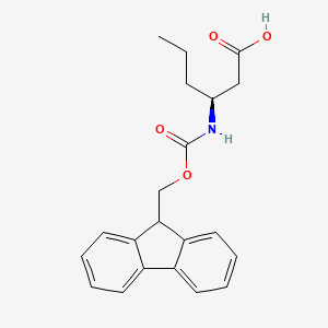The primary mechanism of action of (3S)-3-({[(9H-fluoren-9-yl)methoxy]carbonyl}amino)hexanoic acid involves its role as a protected amino acid in peptide synthesis. The Fmoc group protects the amino group during chemical reactions, preventing unwanted side reactions. Upon deprotection, the free amino group can participate in peptide bond formation, allowing the synthesis of peptides and proteins.