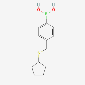 This compound is a member of the arylboronic acid family that features an alkylthioether substituent at the para position of the phenyl ring. The general structure of an arylboronic acid consists of an aromatic ring directly attached to a boronic acid group [-B(OH)₂]. The presence of the thioether linkage introduces a flexible, lipophilic cyclopentyl group connected to the phenyl ring via a methylene (B1212753) spacer. This thioether functionality can potentially influence the electronic properties of the arylboronic acid and its reactivity. Thioethers are known to be effective ligands for transition metals, which could impact catalytic cycles in reactions involving this compound. nih.gov While specific research on this compound is limited, its structure is analogous to other studied thioether-containing phenylboronic acids, such as (4-(methylthio)phenyl)boronic acid. sigmaaldrich.com The study of such derivatives provides insights into how the interplay between the boronic acid moiety and the thioether group can be harnessed for various synthetic applications.